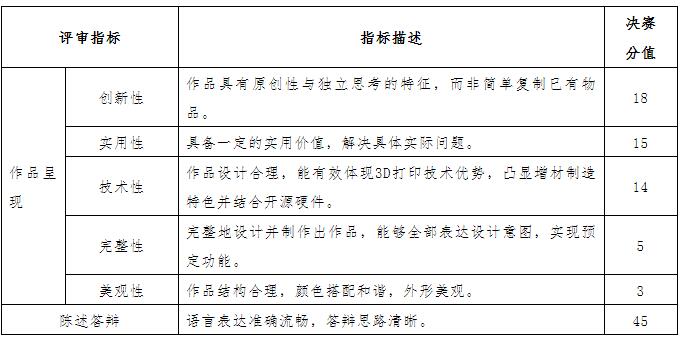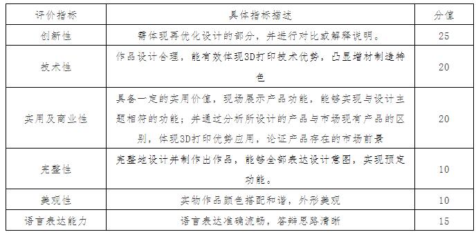 决赛为现场赛,要求选手基于初赛作品进行再优化设计,并通过3D打印的方式制作出作品实物,决赛现场需依据答辩PPT和作品实物进行展示、答辩。要求在答辩PPT文件中,对进行优化设计的部分进行对比或解释说明;需体现作品的商业性,除通过测试产品功能体现其实用价值,解决具体实际问题外,还需通过分析所设计的产品与市场现有产品的区别,体现3D打印优势应用,论证产品存在的市场前景。