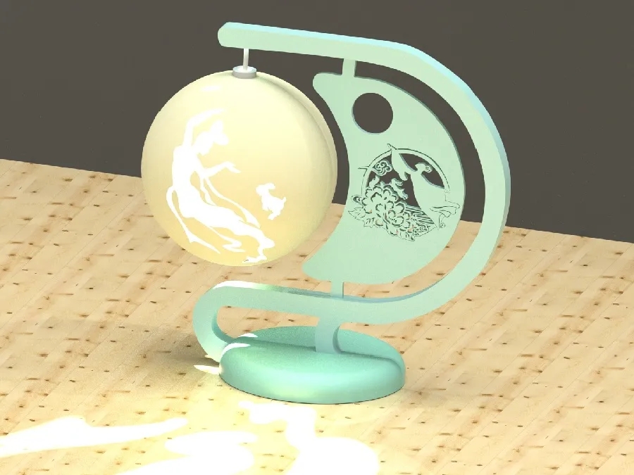 作品阐释:“嫦娥奔月”是中国古代经典神话之一。《月娥青灯》以球形的悬挂式灯罩为核心,融入了传统文化中的榫卯结构、剪纸艺术和屏风,通过3D打印技术使复杂工艺快速实现。当灯点亮,墙壁上投影出嫦娥奔月的婀娜身姿,开启一场神话与科技的交织与碰撞。