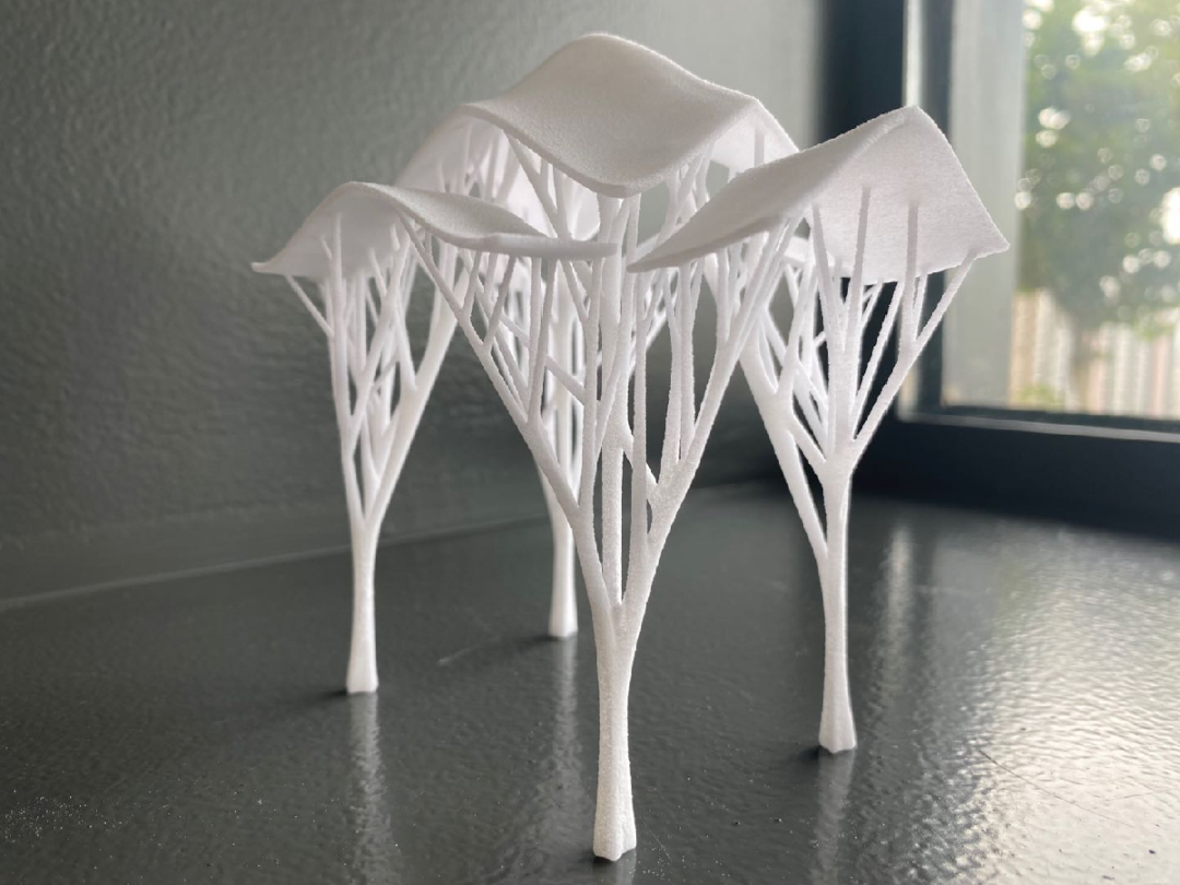作品阐释:《树亭》继承发扬中国传统“树形建筑”的建构精神,利用原创的结构优化算法“双向渐进结构优化法(BESO)”以及自主研发的插件Ameba,在预先设定的荷载与边界条件下生成结构性能最为合理的“树形”结构体系,通过FDM高性能聚合物打印模式,借助大型机械臂3D打印智造技术,最终呈现出纤细且优雅的树形建筑物。