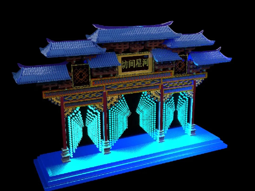 作品阐释:《坊间星河》以古牌坊“乔家大院”为原型,融入清华大学二校门的结构特点,添加了龙、凤、麒麟及祥云等代表吉祥的中国元素。作品将传统文化符号“牌坊”与现代科技“无限隧道灯”巧妙结合,打造出一种古典美与科技美相融合的现代新型灯具,呈现一种灯火通明、一望无尽的繁华闹市景象。