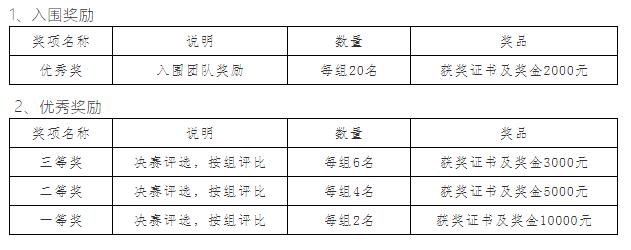 每个组别将筛选20名晋级全国决赛,对进入决赛的入围团队和决赛现场评选出一、二、三等奖的团队进行奖励。