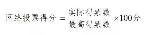 ②网络投票得分计算方式:网络投票得分原则是通过最终票数转换为实际分值,具体转换方式为:以得票数最高的选手票数为基准,给予满分100分,其他选手得分数计算方式以下公式: