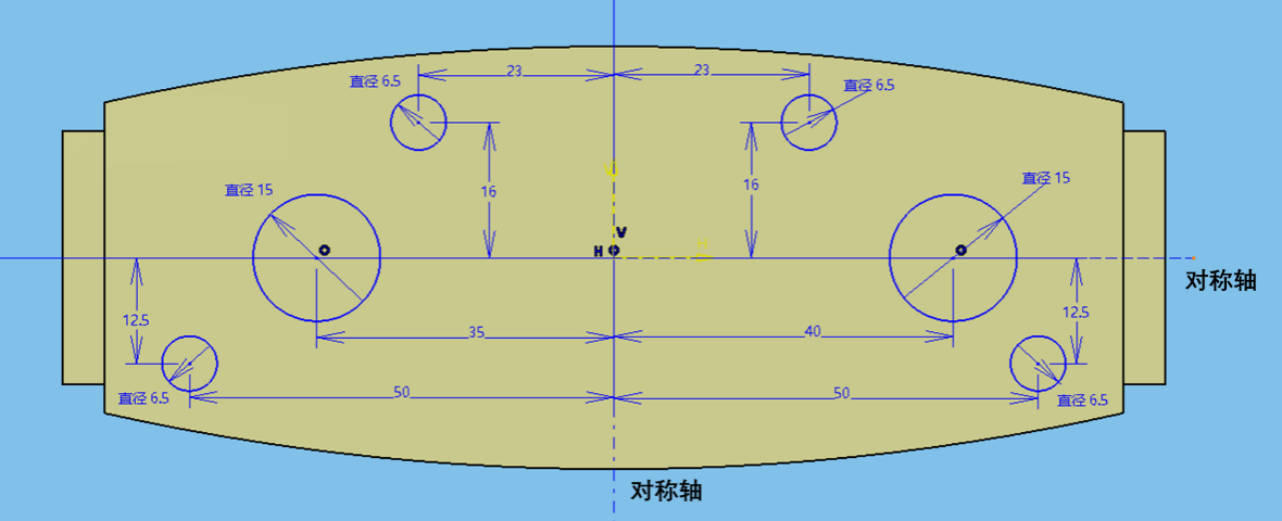 (1)设计对象如图1所示,上部有2个通孔与φ6工装夹具穿销连接,下部有2个通孔与φ6工装夹具穿销连接。肋板中部有2个φ15通孔,用于其他管道或设备穿过肋板。通孔与肋板对称轴的相对关系如图2所示。