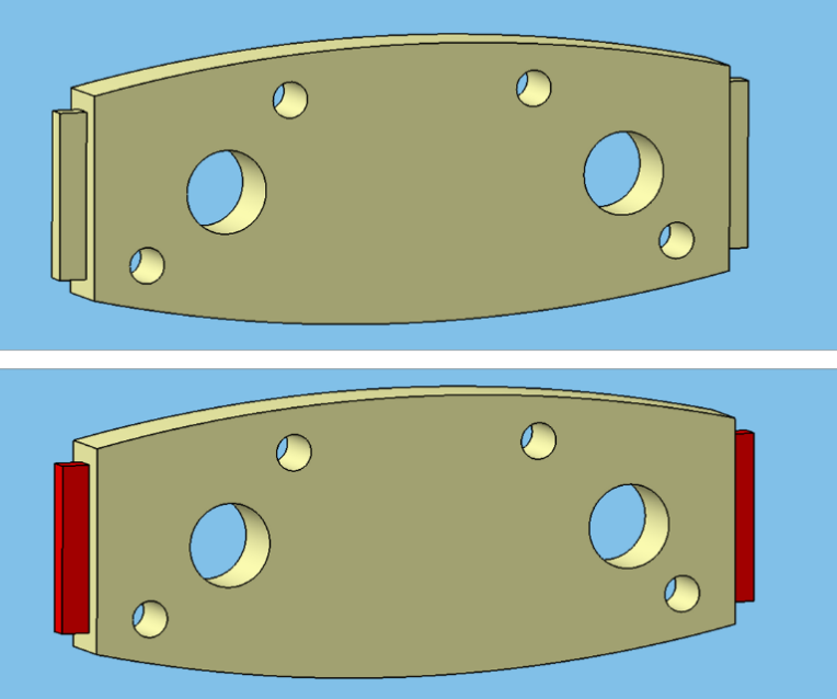 (2)比赛要求设计范围不得超出题目给定的区域(图1黄色部分);6个通孔的相对位置与直径不得改变;肋板两端(图1红色面)必须保留;其余部分可自由设计;肋板应该设计为一个整体结构。