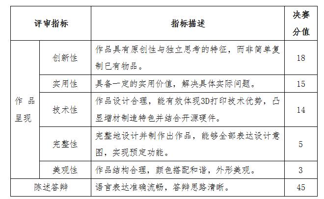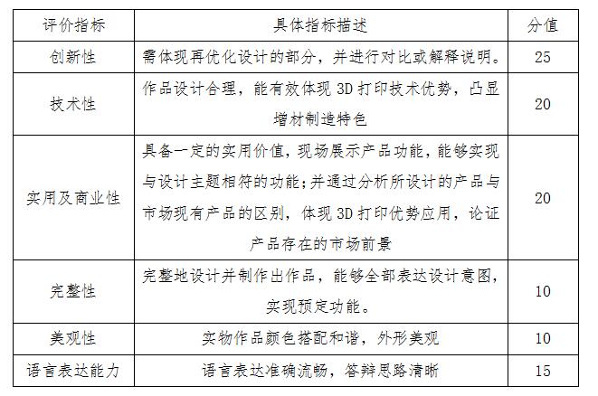 决赛采取线上和现场相结合的方式,要求选手基于初赛作品进行再优化设计,并通过3D打印的方式制作出作品实物,决赛现场需依据答辩PPT和作品实物进行展示、答辩。要求在答辩PPT文件中,对进行优化设计的部分进行对比或解释说明;需体现作品的商业性,除通过测试产品功能体现其实用价值,解决具体实际问题外,还需通过分析所设计的产品与市场现有产品的区别,体现3D打印优势应用,论证产品存在的市场前景。
