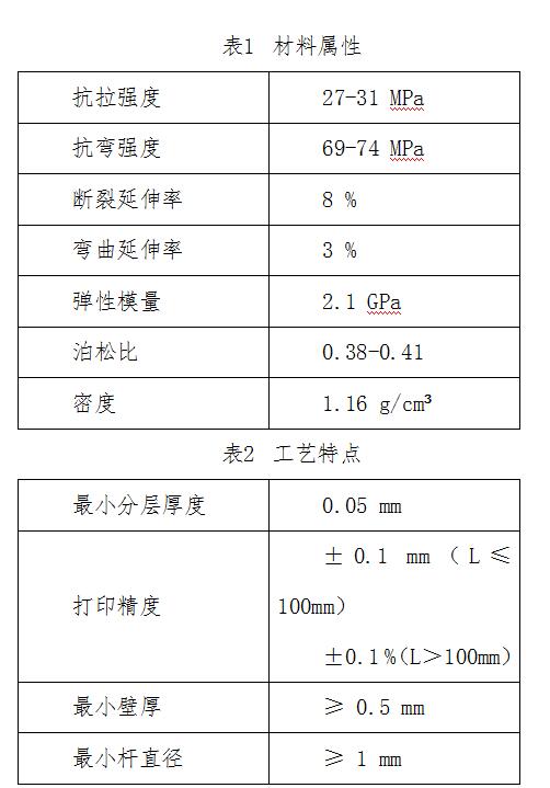 (4)比赛作品采用SLA工艺制造,材料为光敏树脂,材料属性如表1所示,工艺特点如表2所示。