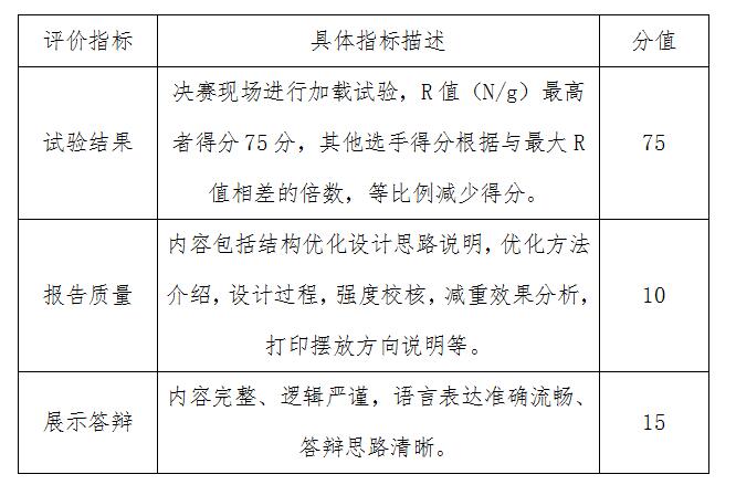 决赛为现场赛,采取赛前统一公布命题、自行设计、统一打印,现场展示答辩和测试验证的形式进行比赛,评委通过对设计报告、现场加载试验和答辩的表现及结果进行评判、得分。