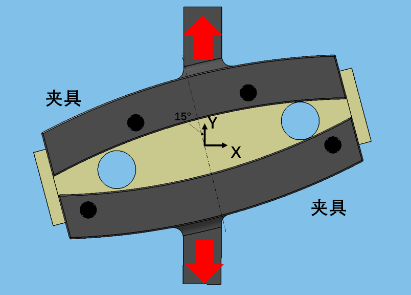 (3)性能测试方法为拉伸试验机沿Y轴方向加载,肋板的垂直对称轴与Y轴成15°角关系,如图3所示。