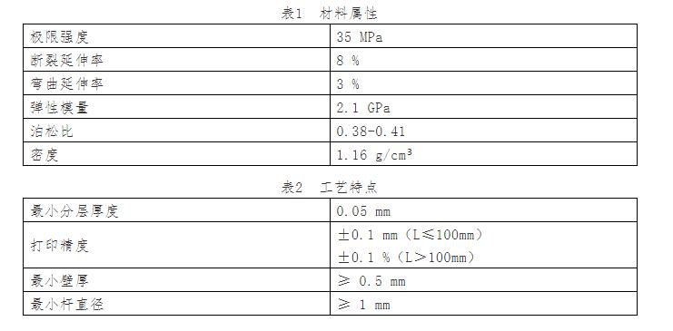 (3)比赛作品采用SLA工艺制造,材料为光敏树脂,材料属性如表1所示,工艺特点如表2所示。