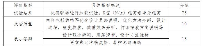 决赛为现场赛,采取赛前统一公布命题、自行设计、统一打印,现场展示、答辩、测试验证的形式进行比赛,评委通过对设计报告、现场加载试验和答辩的表现和结果进行评判、得分。