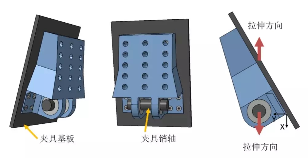 (2)接头用25个M3螺栓固定在夹具上,螺栓的抗拉强度为800MPa,屈服强度为640 MPa,最终的优化设计方案可以舍弃部分螺栓孔。耳片内销轴与另一个夹具固定。决赛现场将进行力学性能测试试验,拉伸试验机的载荷施加方向为X轴方向,如图3所示。